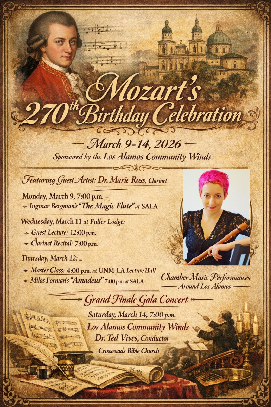 The Los Alamos Community Winds is sponsoring a week-long series of events and performances, culminating with a Gala Concert on March 14, 7:00pm, at Crossroads Bible Church. The concert will feature as a special guest clarinet soloist and Mozart scholar, Dr. Marie Ross. In addition to Mozart classics such as the Overture to The Marriage of Figaro, the concert will also include a humorous PDQ Bach arrangement of A Little Night Music.