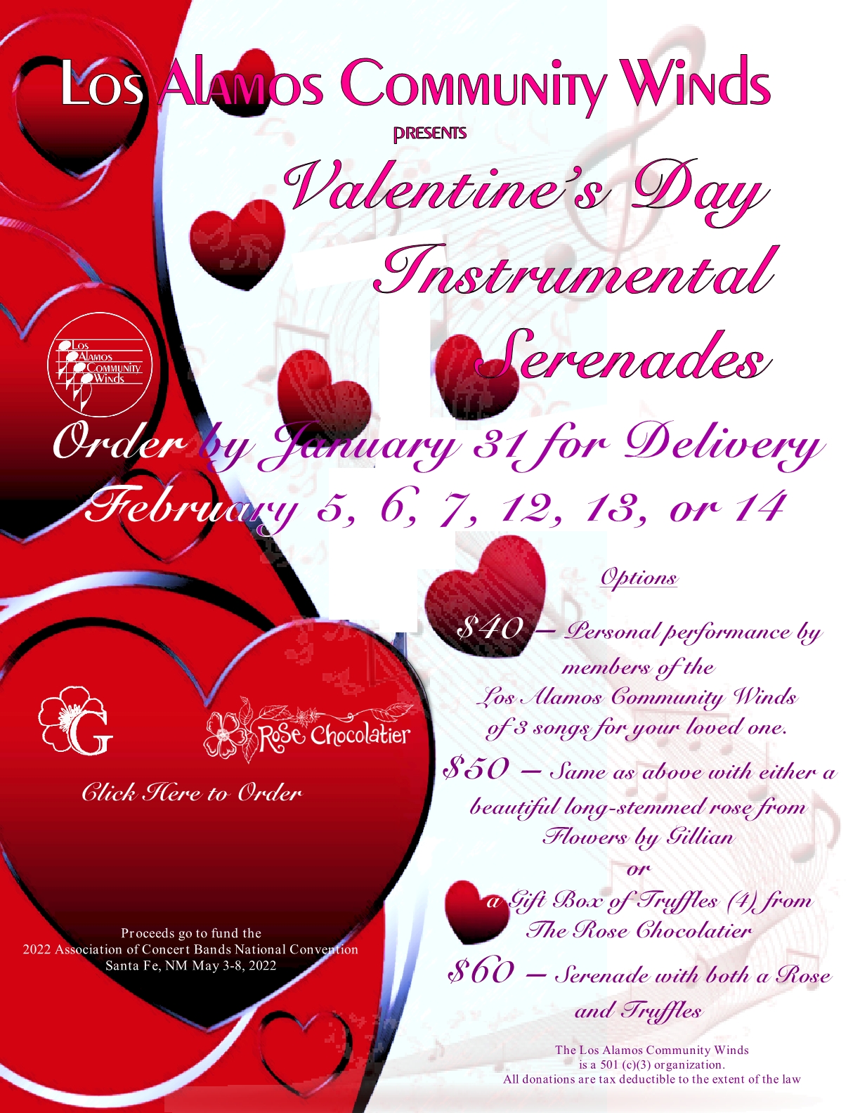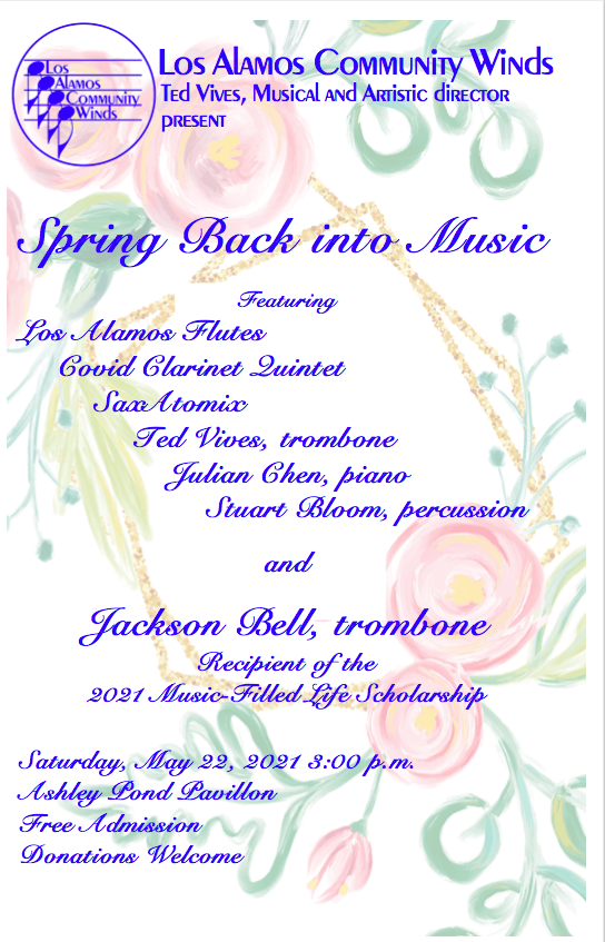 For several months, our community has been without “live” music. The Los Alamos Community Winds will host Spring Back Into Music on Saturday, May 22. At 3:00 p.m. LACW will present a concert at Ashley Pond. The concert will also be live streamed on YouTube. The Los Alamos Flute Choir, Covid Clarinet Quintet, SaxAtomix, Percussionist Stuart Bloom, and LACW director Ted Vives accompanied by pianist Julian Chen will all be performing.